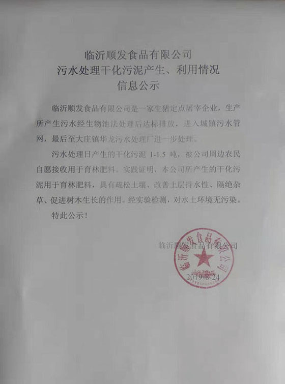 臨沂順發食品有限公司污水處理幹化污泥産生、利用情況信息公示