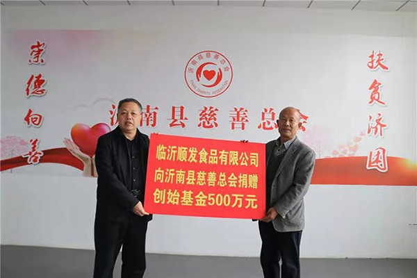 2020年11月23日,縣慈善總會舉行創始基金捐贈儀式,臨沂順發食品有限公司将“留本付息”式創始基金由300萬元提高到500萬元,縣慈善總會會長劉振奎、副會長高善群、秘書長趙遵信,縣慈善總會理事、臨沂順發食品有限公司總經理高則富,縣慈善總會财務基金部部長任德獻...